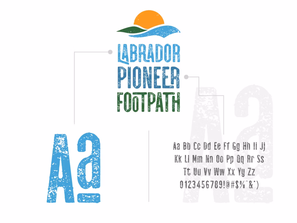 The palette consists of natural tones of blue, green and yellow creating a rich layering of striking colours. The blues and green used in the logo are a homage to the colours used in the Labrador flag while the yellow adds a crisp and clean contrast, representing the light shining over the landscape of the trail system.